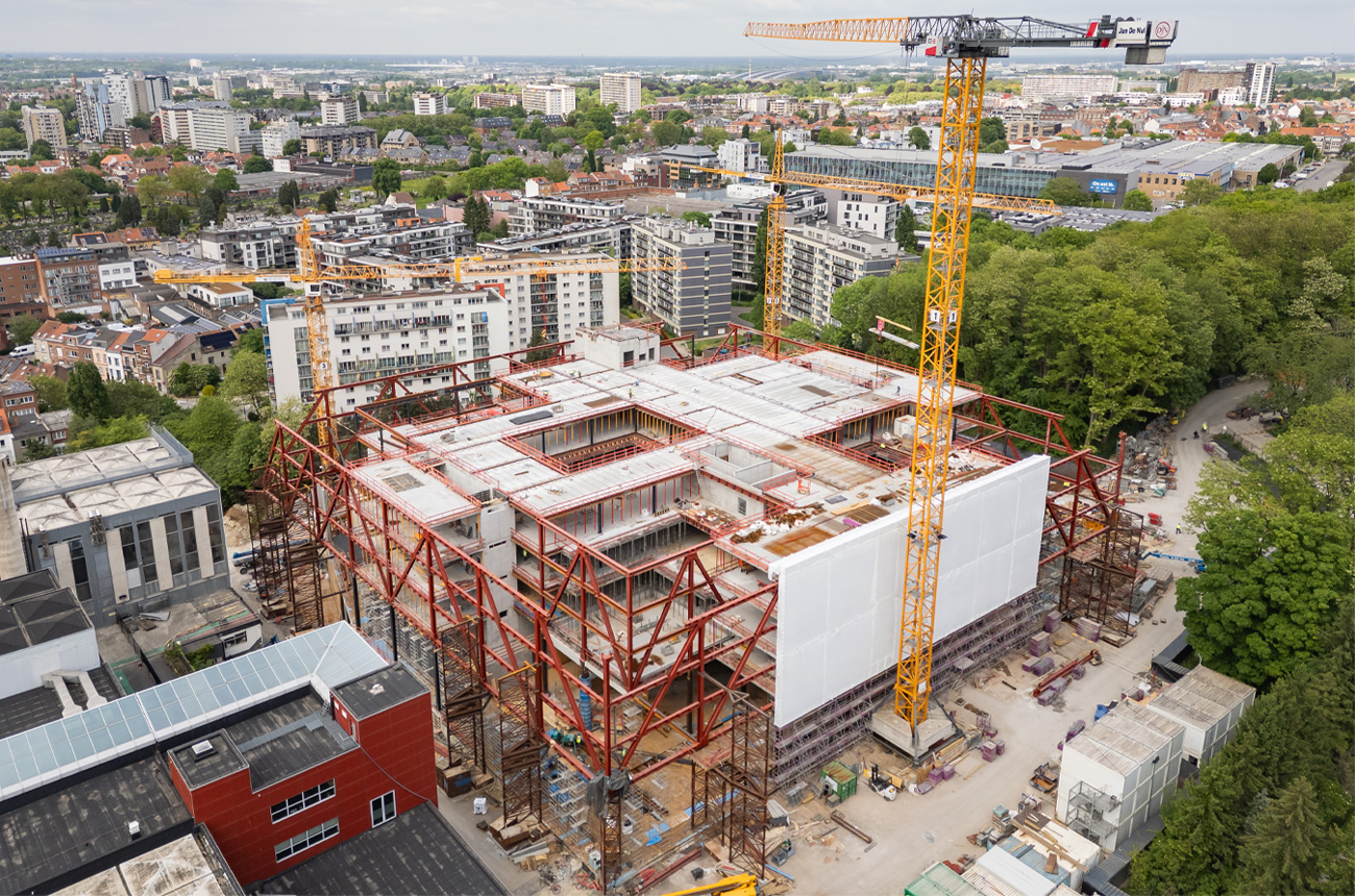 Nova sede do canal público flamengo VRT. Com uma área total de 65,000 m², dos quais 25,000 m² são subterrâneos, a nova sede da VRT contará com cinco grande jardins interiores e terraços adjacentes, criando um ambiente totalmente verde, tanto dentro como fora do edifício.